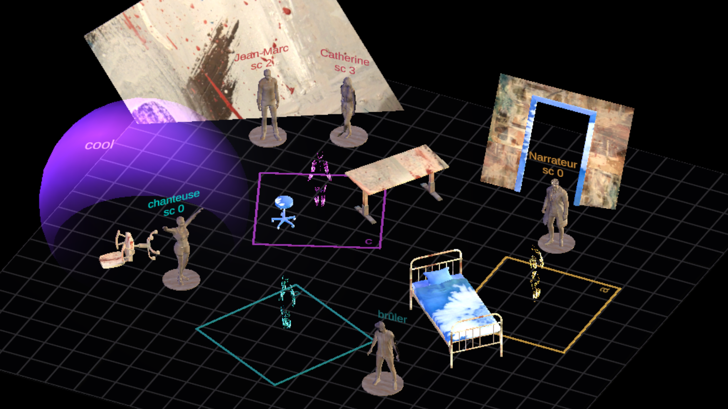 Au-dessus d’une table virtuelle, un·e artiste construit une maquette à partir de blocs de décor, de personnages, de cônes lumineux et de bulles de son. Il·elle doit également placer et orienter différentes zones parcourables à l’intérieur de la maquette. En appuyant sur un bouton, il·elle peut acquérir l’échelle et le point de vue de la zone qu’il·elle regarde. En pouvant osciller entre l’échelle du·de la metteur·se en scène et celle de l’immersant·e, l’artiste peut passer à tout moment du point de vue de la création à celui de la réception afin de construire la structure spatio-temporelle de son œuvre narrative.