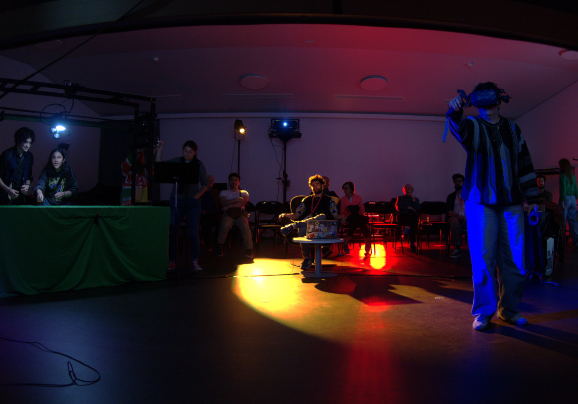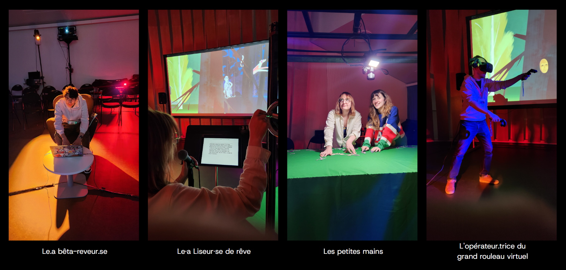Sur le plateau, les publics volontaires seront invités à venir inspirer, décorer et mettre en scène des rêves les plus fous et loquaces possibles pour nourrir cette intelligence artificielle avide de créativité. Chacun pourra contribuer en manipulant décors, objets et personnages, à la fois réels et virtuels, pour donner forme à des visions inédites. Ces créations collectives viendront enrichir un gigantesque « Rouleau-Rêve, » une estampe interactive en perpétuel mouvement, manipulée par un·e des participant·es en Réalité Virtuelle.